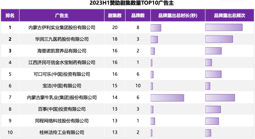 根据艺恩数据显示,2023年上半年,赞助剧集数量最多的广告主为伊利,赞助剧集数量为20部,蒙牛以14部排名第七位。