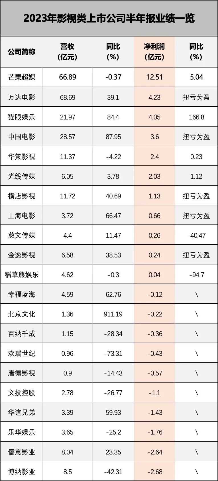 博纳是最让人有些意外的,上半年竟然亏损2.68亿元,是21家公司中亏损最多的。但是细细想来也合理,2022年春节档博纳有《长津湖之水门桥》,超过40亿元的票房成绩帮助博纳业绩回血,但是2023年春节档到暑期档,博纳没有一部能够拿得出手的作品,形成档期真空,业绩自然处于谷底。