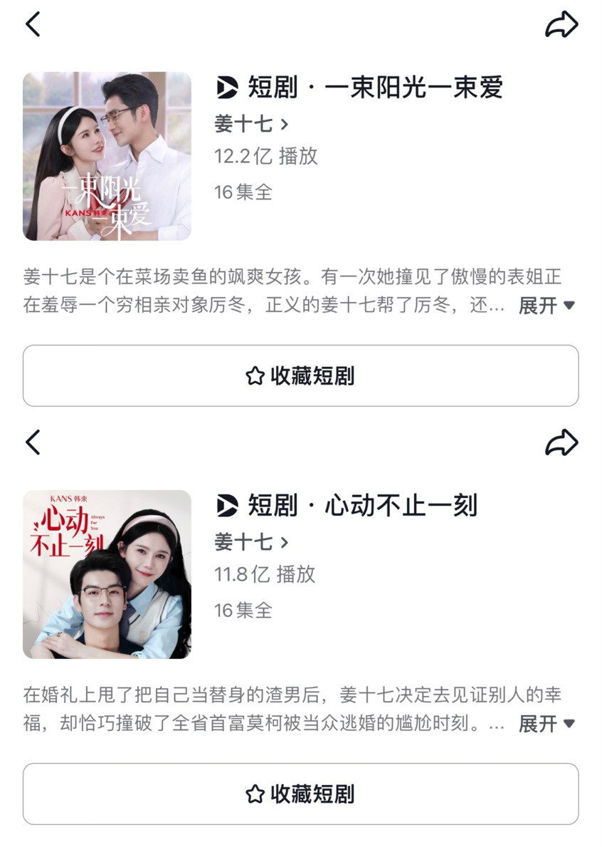 抖音方面,与柠萌影业持续牵手推出《流量背后》《二十九》第二季,不论口碑还是播放量都未能带动抖音短剧更上一层楼。而在这期间,抖音短剧频道内虽涌现了《心动不止一刻》《一束阳光一束爱》两部累计播放量破10亿的作品,但无一例外,陷入一种站内热热闹闹,站外无人问津的尴尬境地。