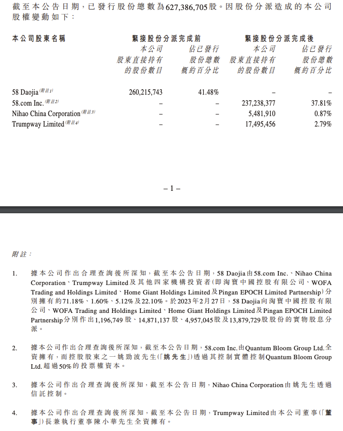 快狗打车9月7日晚间在港交所公告,公司已获公司控股股东之一58 Daojia Inc.告知,58 Daojia已通过特别实物股息分派的方式向其股东(即58.com Inc.、Nihao China Corporation及Trumpway Limited)分派260,215,743股本公司普通股。紧随股份分派完成后,58 Daojia不再为公司股东,且58.com Inc.、Nihao China Corporation及Trumpway Limited将各自成为公司的直接股东,分别持有237,238,377股、5,481,910股及17,495,456股股份。