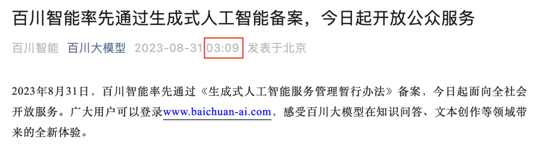 紧接着在凌晨3点,百川智能也宣布通过生成式人工智能备案,即日起开放公众服务,它也用到了“率先”一词。