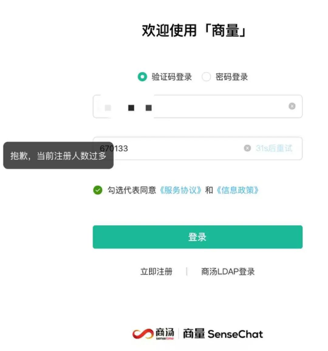 第一批备案名单里的商汤SenseChat,称所有用户都能注册使用。但是当你打开它的官网,会发现无法注册,页面提示“抱歉,当前注册人数过多”。