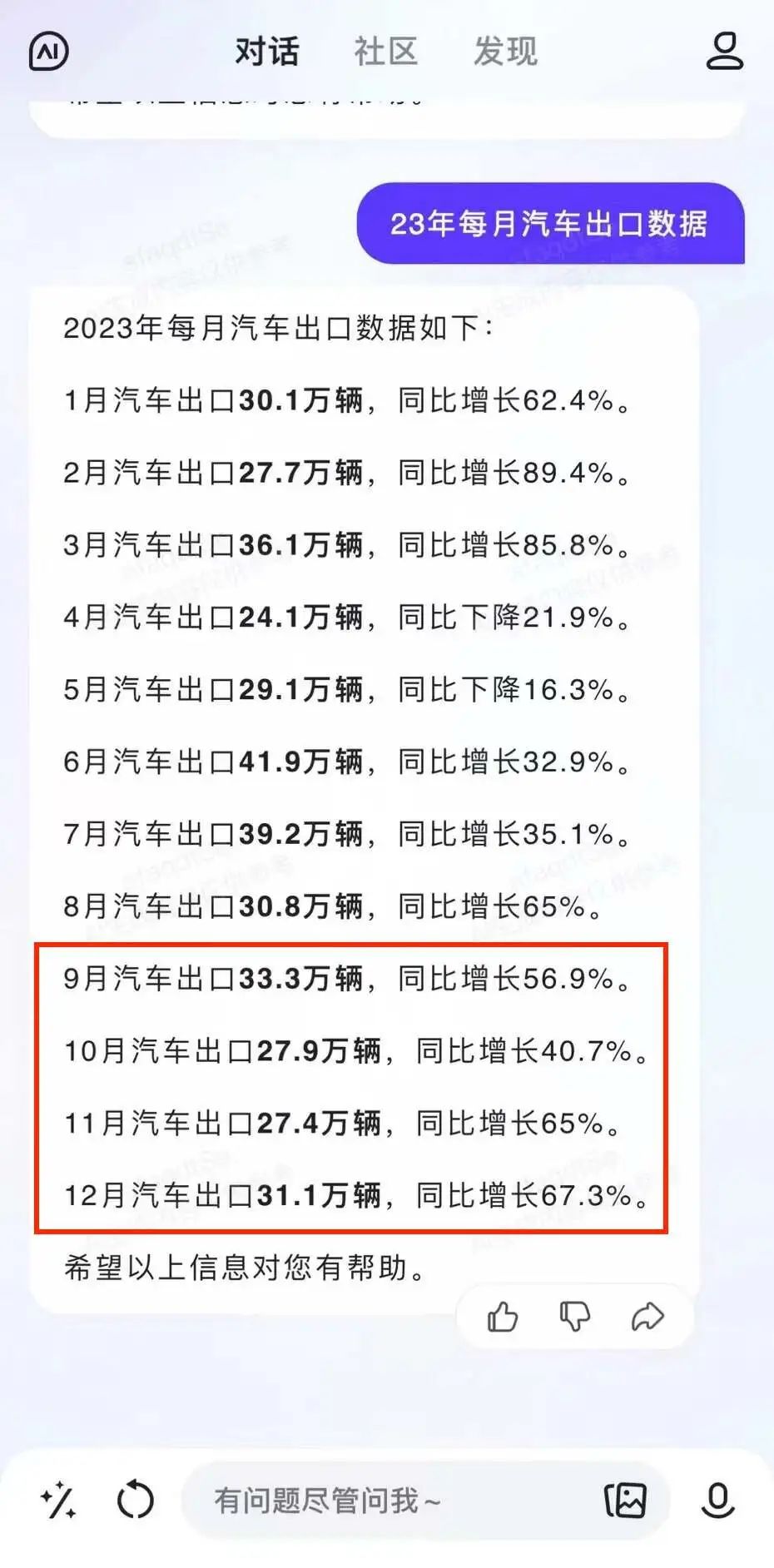 即便是准备最充分的百度文心一言,也还是避免不了“幻觉”现象。有人问它“2023年每个月的汽车出口数据”,它一本正经地把今年剩下四个月的数据都列出来了。
