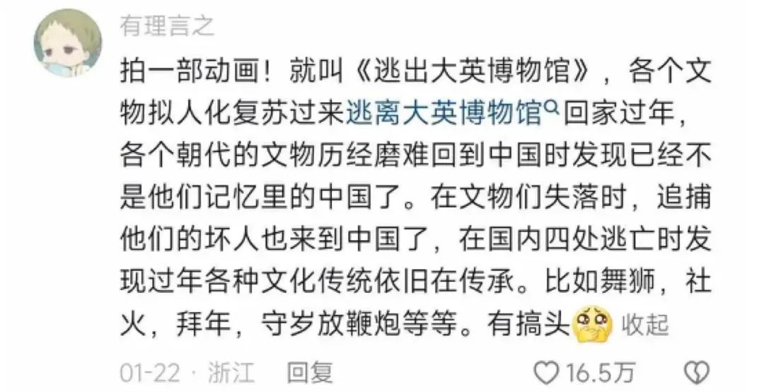 《逃出大英博物馆》灵感源起要追溯至今年1月,彼时留学生博主“何香蓓Betty”在抖音发布了一则参访大英博物馆的视频,网友“有理言之”在评论区留言,提议拍一部“各个文物拟人化复苏过来逃离大英博物馆回家过年”的动画。