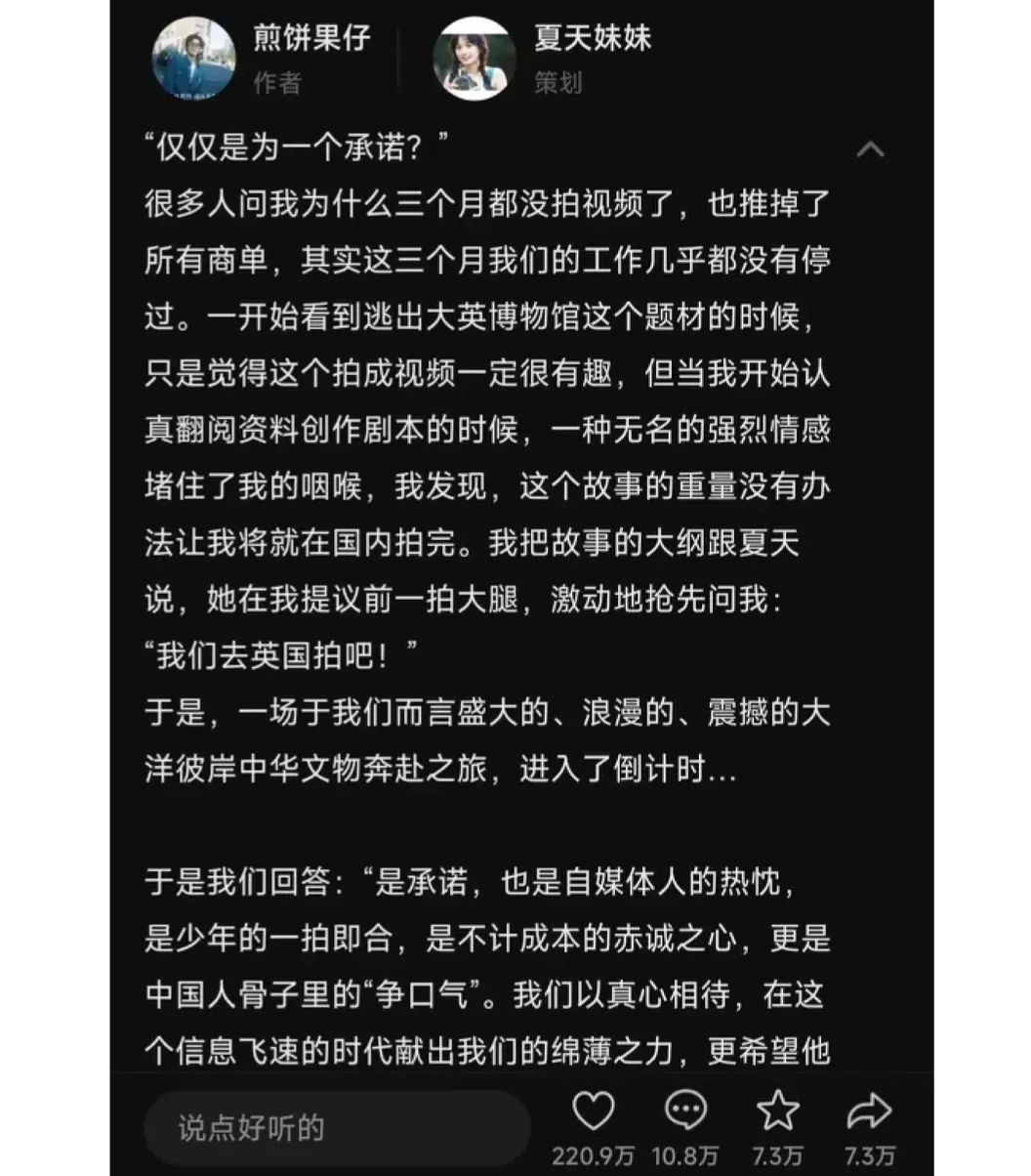 然后就是一个看起来有些“赌博”的创作历程,煎饼果仔曾发文称,为筹备该项目,他和夏天妹妹一并推掉了3个月的商单(谁都明白这对于刚有点流量的自媒体意味着啥)。至于原因,煎饼果仔曾提到,当他认真筹备翻阅资料时,“一种无名的强烈情感堵住了咽喉”。