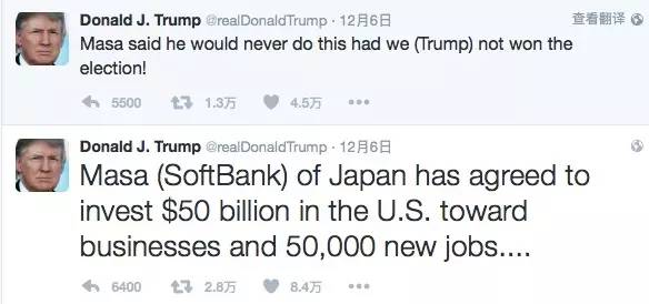 距离特朗普宣誓就职还有 6 周时间,但这位“搞事王”早就不安于次了。先是“神奇”的和台湾总统蔡英文通了电话,然后昨天特朗普又向软银 CEO 孙正义(Masayoshi Son)拉来了 500 亿美元的投资,事后还在 Twitter 夸耀:“孙正义说要不是我当总统,他永远不会给美国投钱。”