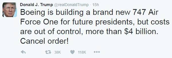 这还不够,昨天特朗普又发了一则推文,呼吁取消同波音建造美国总统专机 “空军一号”(Air Force One) 的订单,理由是:“这家飞机大大超出了预算!”