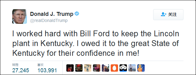 在竞选期间,特朗普曾经多次攻击福特将小型车的生产转移到了墨西哥。作为这件事的后续,上个月特朗普发了一条 Twitter:“我和比尔 · 福特(注:现任福特汽车公司执行董事长)做了艰苦的努力,将林肯汽车制造厂留在肯塔基州。这是我对肯塔基州人民信任的回报!”