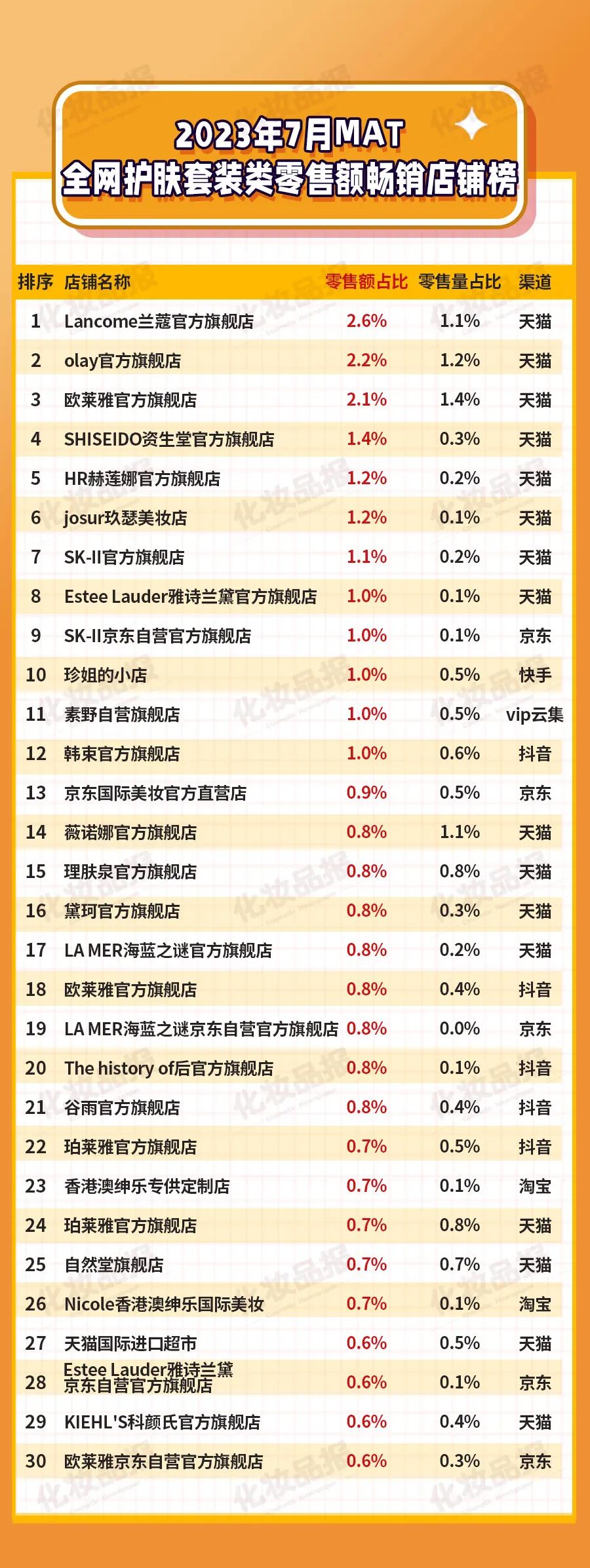 从全网护肤套装类畅销店铺来看,Lancome兰蔻官方旗舰店以超16.97亿元的零售额、336.25万件的零售量夺得最畅销店铺的桂冠;olay官方旗舰店、欧莱雅官方旗舰店紧随其后,为最畅销品牌店铺前三。josur玖瑟美妆店位居榜单第六,是唯一进入TOP10的国货品牌店铺。据悉,玖瑟公司前身以经营化妆品代理贸易起家,拥有十年化妆品操盘策略和客户需求,2017年南下广州开发彩妆品牌,建立起了健全的化妆品市场体系。