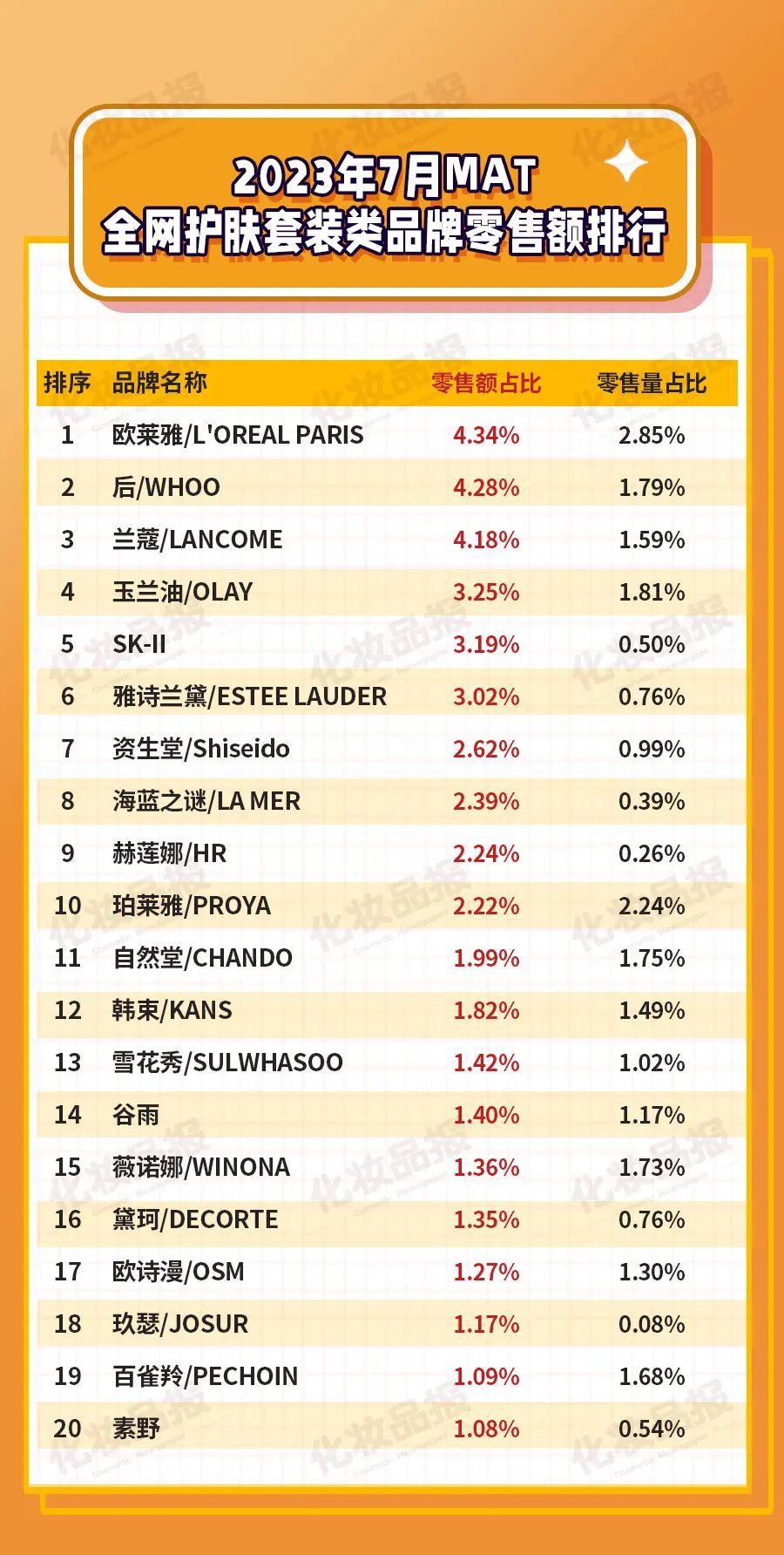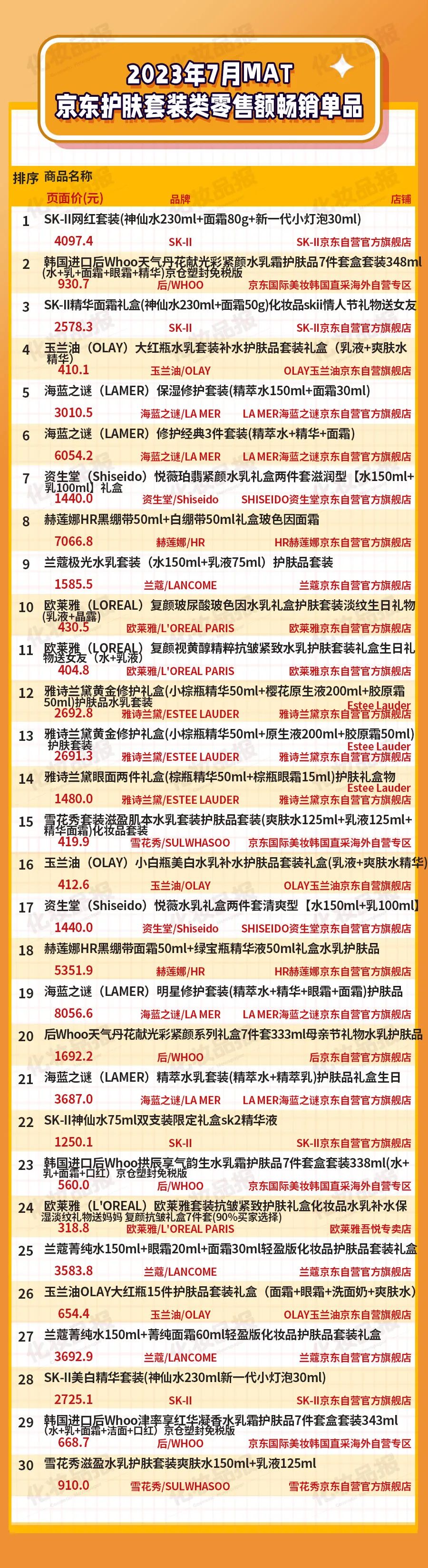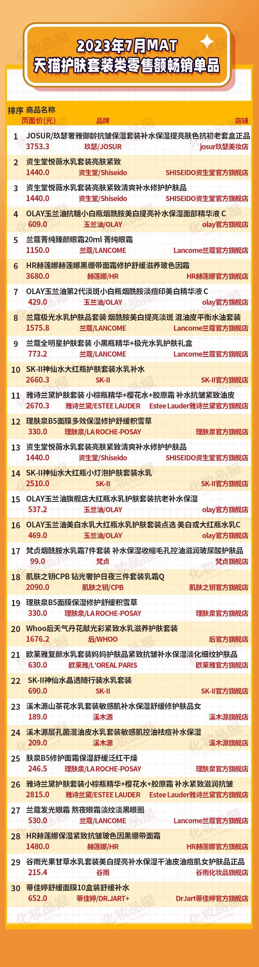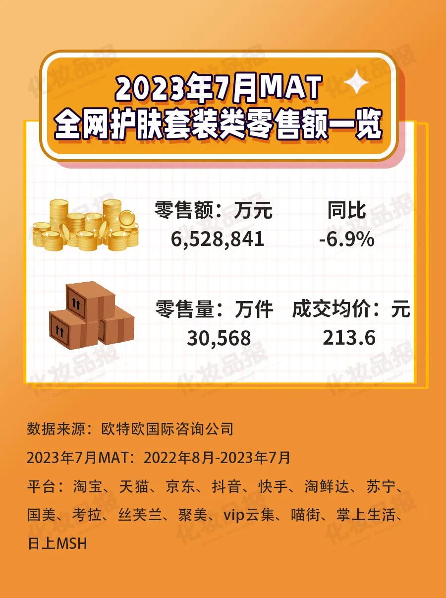欧特欧国际咨询公司统计的数据显示,2023年7月MAT(2022年8月至2023年7月),全网(包括淘宝、天猫、京东、抖音、快手等平台在内)护肤套装类零售额为652.88亿元,同比减少6.9%,零售量3亿件,成交均价213.6元。