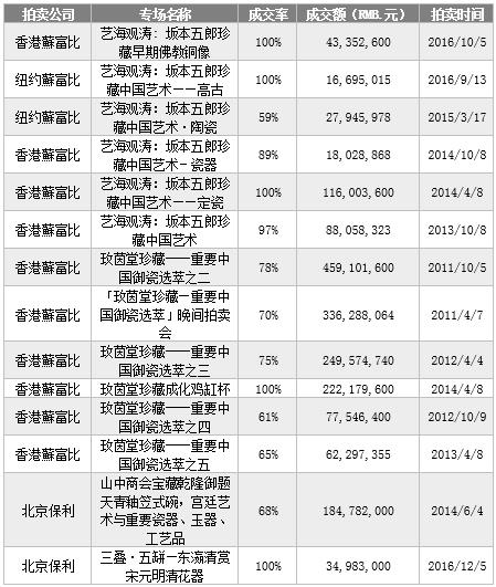 自2011年开始,海外回流器物专场在各大拍卖行如雨后春笋般纷纷出现,香港苏富比持续推出了“玫茵堂”、“坂本五郎”的专场,北京保利也陆续推出“山中商会”、东瀛花器专场。由图可见,回流拍品以日本为主,成交率均在50%以上,其中5个专场给出白手套的成交结果。
