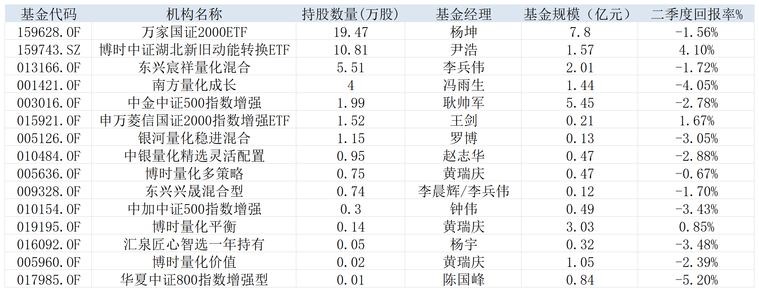 其中,万家国证2000ETF持有该个股数量最多,为19.47万股。这是一只跟踪国证2000指数的被动指数型基金,截至二季度末,基金规模为7.8亿元。二季度,基金回报率为-1.56%。