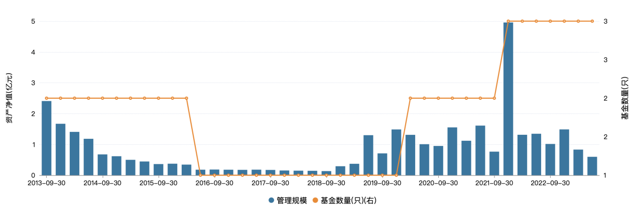 华宸未来基金成立之初,规模曾超过2亿元,而后急转直下,2018年三季度末出现“冰点”,规模仅剩0.13亿元。之后规模增长有所起色,2021年末一度达到了4.96亿元。之后又大幅缩水,直至目前仅剩0.60亿元。