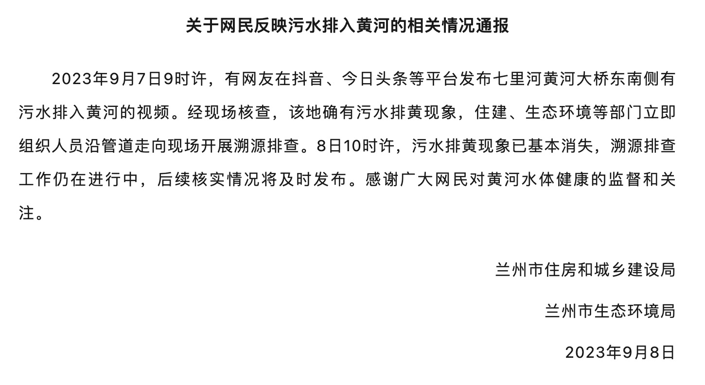 “兰州发布”微信公众号消息,兰州市住房和城乡建设局、兰州市生态环境局发布关于网民反映污水排入黄河的相关情况通报:2023年9月7日9时许,有网友在抖音、今日头条等平台发布七里河黄河大桥东南侧有污水排入黄河的视频。经现场核查,该地确有污水排黄现象,住建、生态环境等部门立即组织人员沿管道走向现场开展溯源排查。8日10时许,污水排黄现象已基本消失,溯源排查工作仍在进行中,后续核实情况将及时发布。