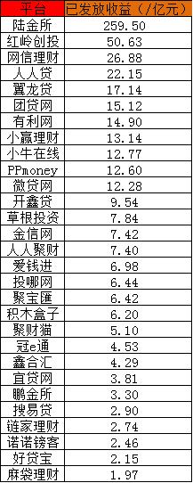 投资人从29家平台总共获得548.60亿元的投资回报,其中,从陆金所得到的收益最多,达到259.5亿元,其次为红岭创投、网信理财、人人贷以及翼龙贷,分别从中得到50.63亿元、26.88亿元、22.15亿元、17.14亿元。