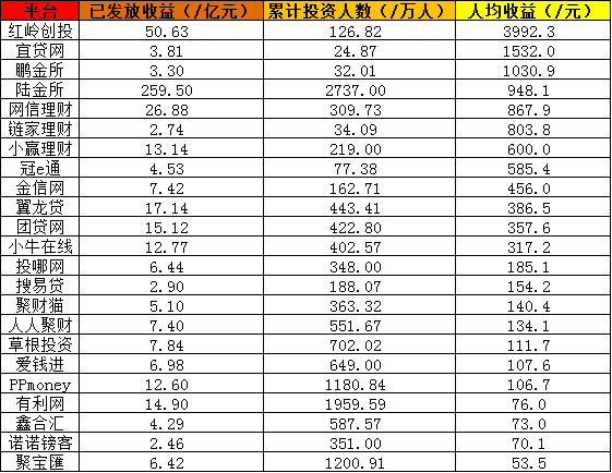 注:数据均来自平台官网;“累计投资人数(/万人)”一栏的数据,来自平台官网公布的投资人数或注册人数。理论上讲,平台注册用户包括了借款人和投资人,获得收益的主体是投资人而非整体注册用户。但部分平台仅有披露注册用户数,而没有公布投资人人数,对此,统计会将注册用户视为收益的主体。以此方法得到的人均收益和实际情况存在误差是肯定的,这一点还请读者了解。
