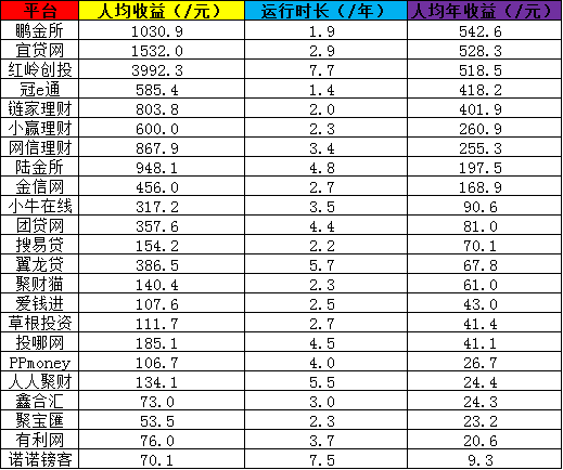 人均收益只能反映用户在平台的收益状况,并不能考量平台为用户赚钱的能力,因为它没有将平台的运营时长纳入统计。