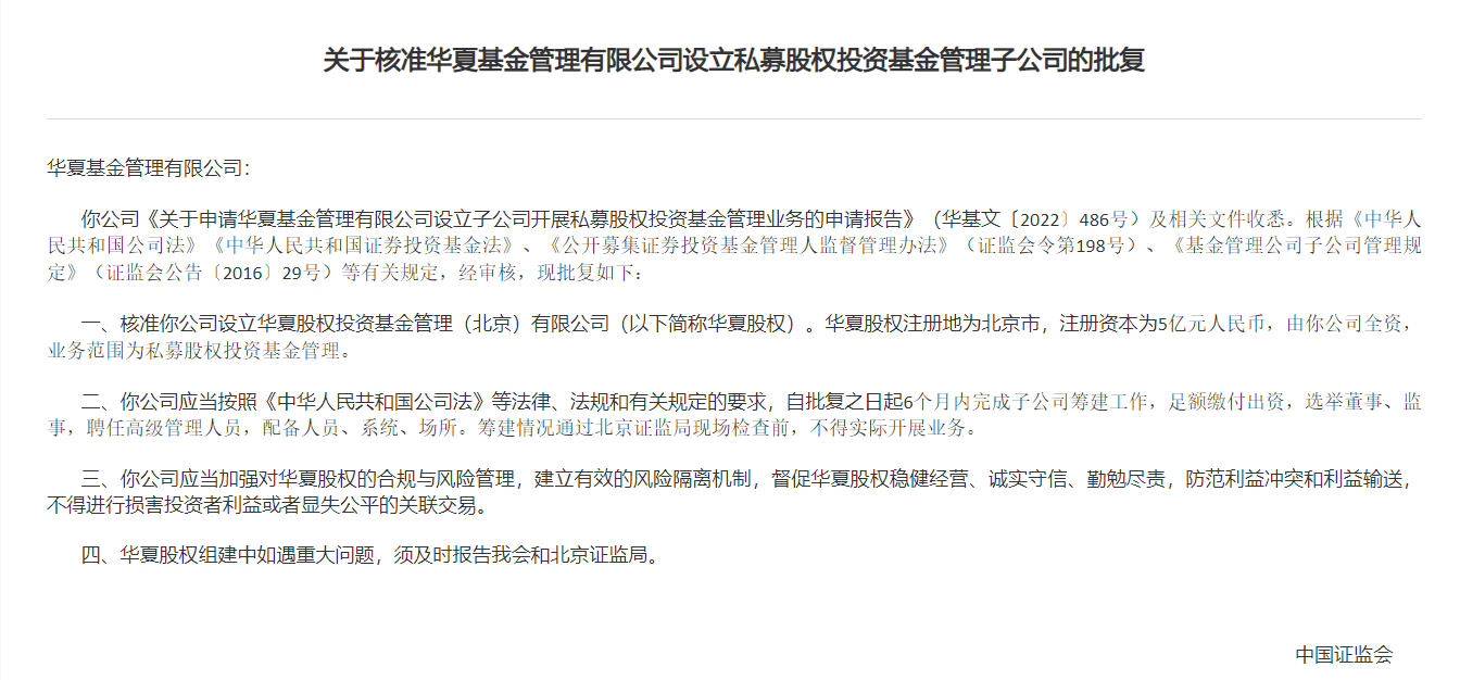 日前,证监会发布了《关于核准华夏基金管理有限公司设立私募股权投资基金管理子公司的批复》(以下简称《批复》),批复如下: