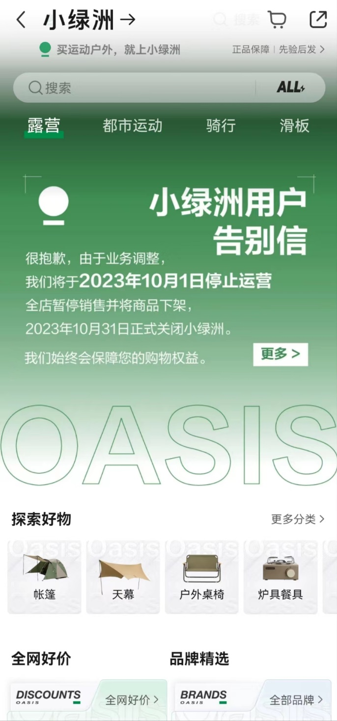 在用户告别信中,小绿洲称,成立一年多,深耕露营、陆冲、滑雪、骑行、徒步等运动场景,但在业务探索和发展中,没能实现最大化满足用户户外需求的预期目标,慎重考虑下决定关停。