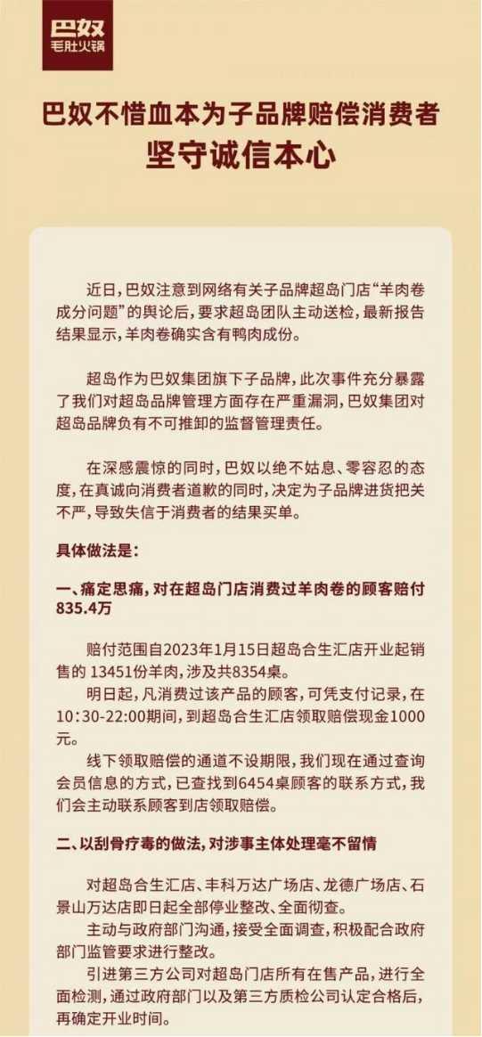 另一方面,细节部分刮骨疗毒,巴奴表示,即日起对超岛合生汇店、丰科万达广场店、龙德广场店、石景山万达店全部停业整改、全面彻查。巴奴将对在超岛门店消费过羊肉卷的顾客赔付835.4万元,赔付范围自2023年1月15日超岛合生汇店开业起销售的13451份羊肉,涉及共8354桌。即日起,凡消费过该产品的顾客,可凭支付记录,在10:30-22:00期间,到超岛合生汇店领取赔偿现金1000元。
