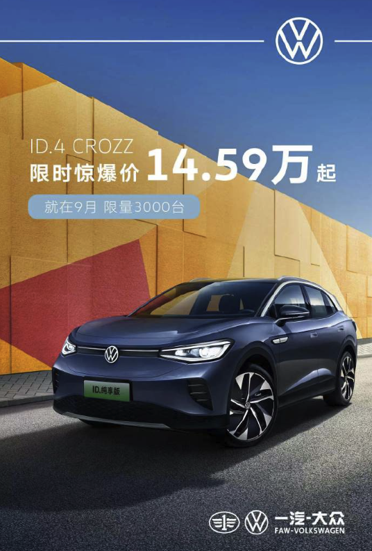 9月8日,一汽-大众官博宣布推出9月购车优惠活动,ID.4 CROZZ限时售价14.59万起,限量3000台。
