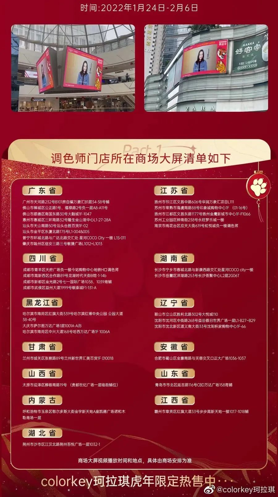 以 COLORKEY珂拉琪为例,去年 1 月 20 日,品牌官宣入驻 THE COLORIST调色师的时候,就曾携手代言人迪丽热巴在春节期间,在 THE COLORIST调色师全国 32 个门店强势霸屏。