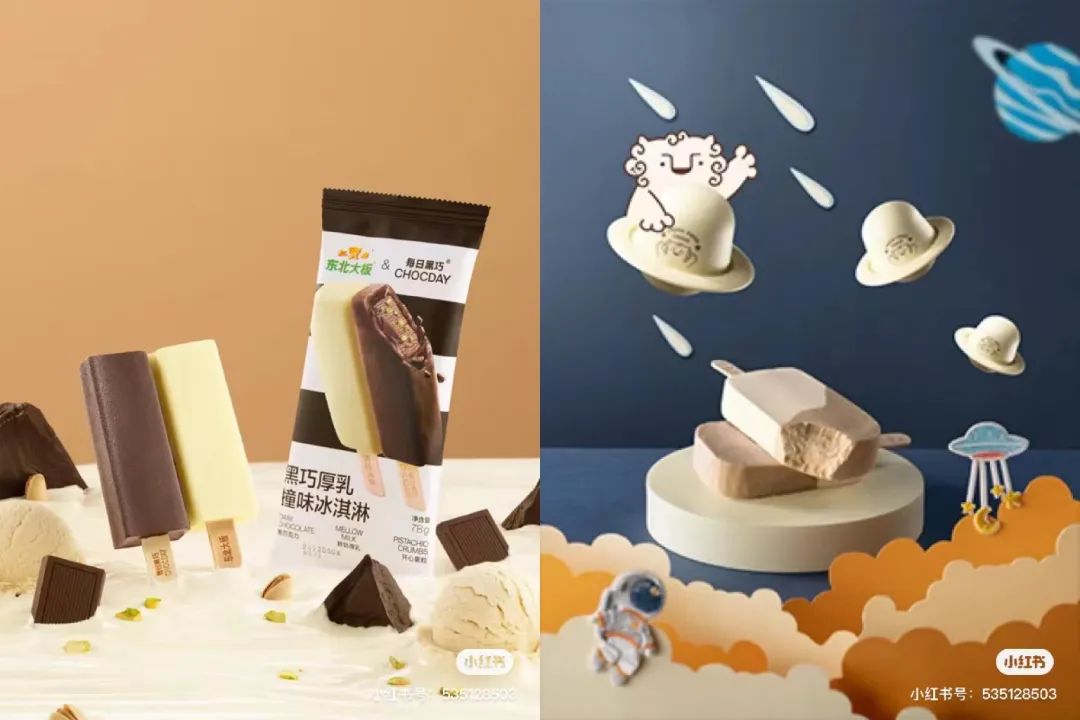 比如伊利旗下有中高端冰淇淋品牌甄稀和国潮冰淇淋品牌须尽欢;蒙牛旗下有高端冰淇淋品牌蒂兰圣雪,还和茅台冰淇淋合作推出产品;东北大板也顺势而为,通过与每日黑巧、永璞等新品牌联名、线下铺独立冰柜等方式,推动品牌的中高端进程。
