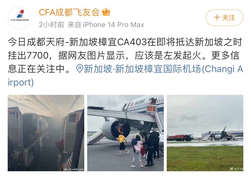 新加坡樟宜机场也在官方账号发布公告称,始发于成都的中国国航CA403航班在飞往该机场的途中,前货舱和洗手间冒烟。飞机已于16时15分左右降落,所有乘客和机组人员均已安全撤离,左发动机的火已被扑灭。