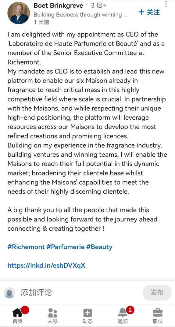 9月7日,Boet Brinkgreve在LinkedIn发文称,“我很高兴被任命为高级香水与美容部门首席执行官以及历峰集团高级执行委员会成员。我将建立并领导这个新平台,使我们的六个香水品牌在这个竞争激烈、规模至关重要的领域达到最高质量。在尊重其独特高端定位的同时,将利用我们旗下品牌的资源,开发最精致的产品和最有前景的授权证书。”