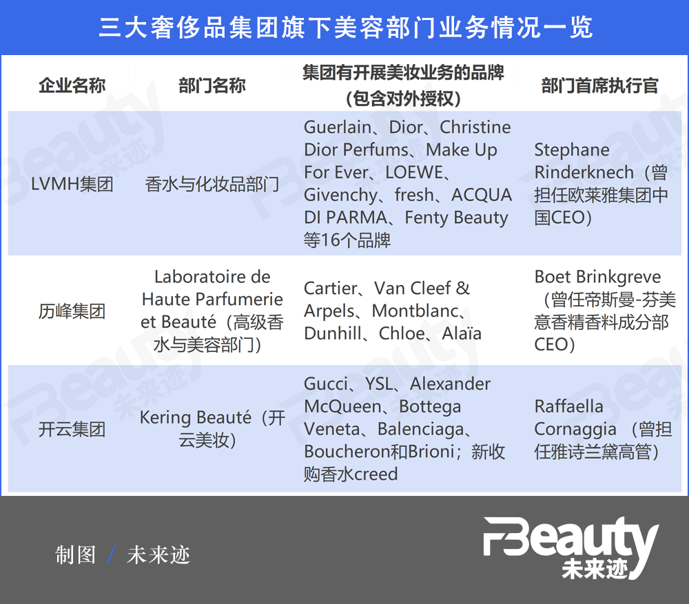 《FBeauty未来迹》整理发现,LVMH之后,历峰集团和开云集团在今年先后行动,目前全球三大奢侈巨头都已经成立了自己的美容与香水部门,并拥有了经验丰富的专业美妆类操盘手。