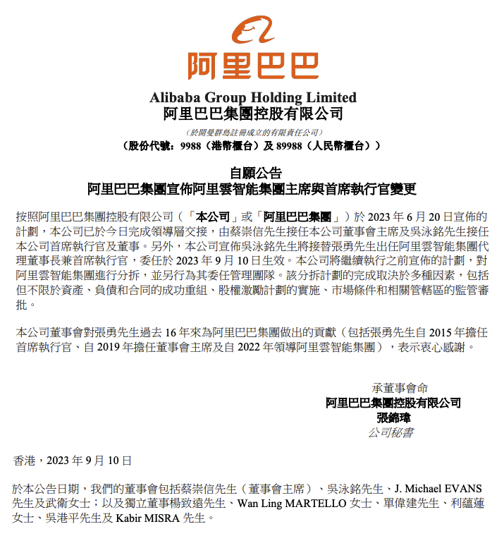 阿里巴巴9月11日早间在港交所公告,按照阿里巴巴集团于2023年6月20日宣布的计划,公司已于今日完成领导层交接,由蔡崇信接任公司董事会主席及吴泳铭接任公司首席执行官及董事。