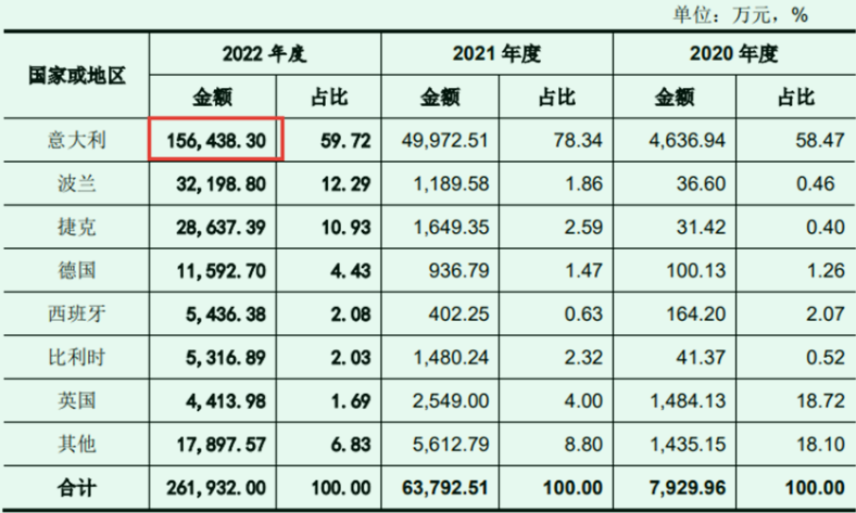 更加离奇的是,首航新能对于意大利的销售,居然都是通过ZCS一家经销商来实现的。2022年,首航新能在意大利实现了189,782.44万元销售收入(见表7)。同样,公司2022年度对ZCS的销售金额也是189,782.44万元(见表8),有零有整,甚至精确到百元。