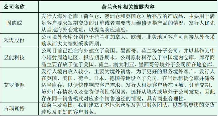 首航新能认为公司在荷兰设置仓库符合行业惯例,具有商业合理性。从上述案例关于海外仓的功能描述中,不难看出上述五家企业的海外仓(见表12),严格意义上都是公司/海外子公司的仓库。