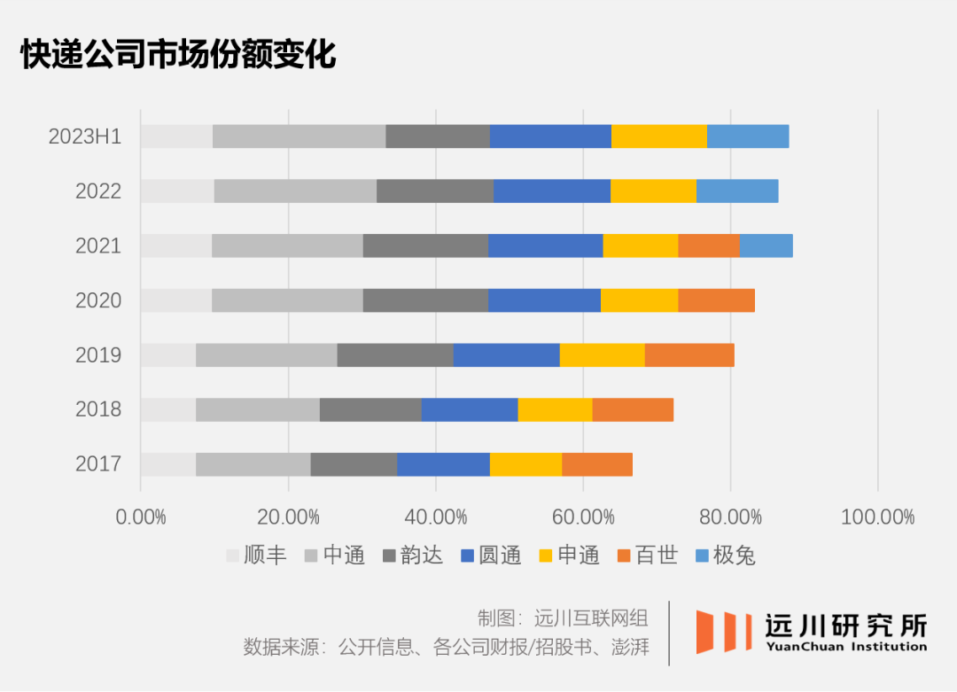 按理来说,在行业增长日趋稳定,后来者进场成本高企的前提下,寡头垄断几乎是唯一结局。这场价格战也的确演变成四通一达+顺丰对中小快递的一场收割;一年下来,六大寡头合占超过80%的市场份额。