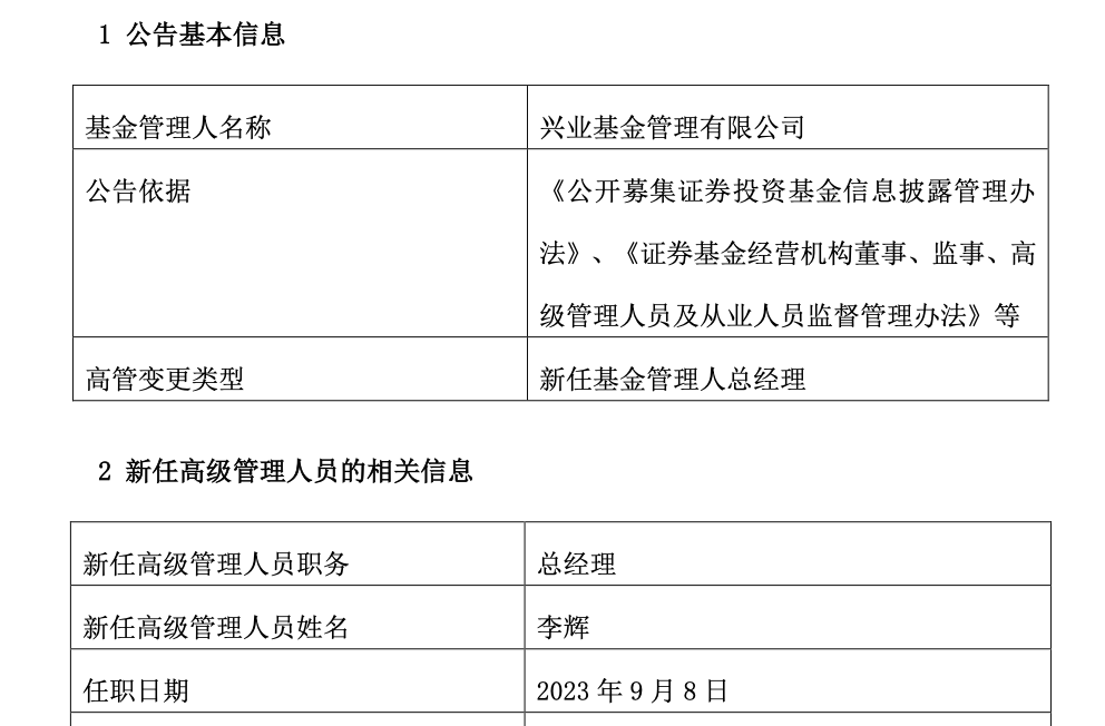 9月9日,兴业基金发布高级管理人员变更公告称,李辉自9月8日起任职公司总经理,董事长叶文煌不再代行总经理职务。