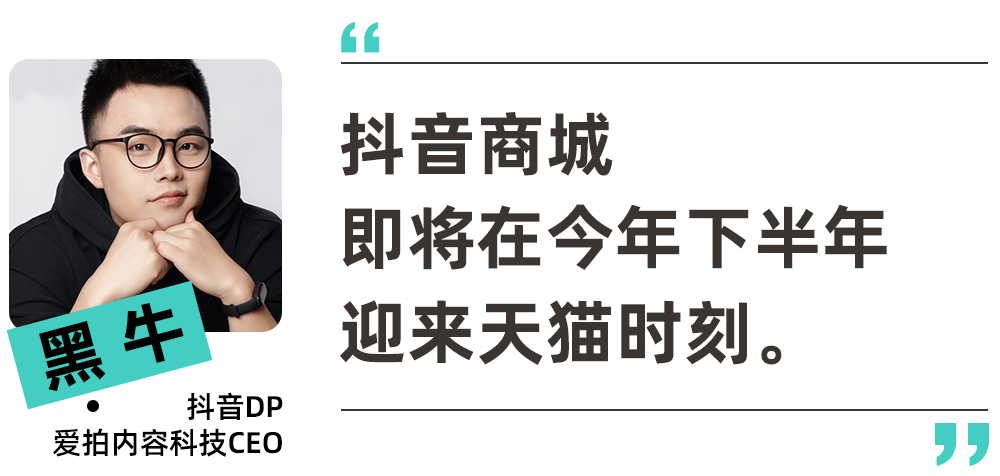 抖音DP、爱拍内容科技CEO黑牛在跟我们交流时大胆预测(核心观点也同步发布在黑牛影记公众号上),抖音商城或将在下半年迎来重要转折点,“它的天猫时刻即将到来”。