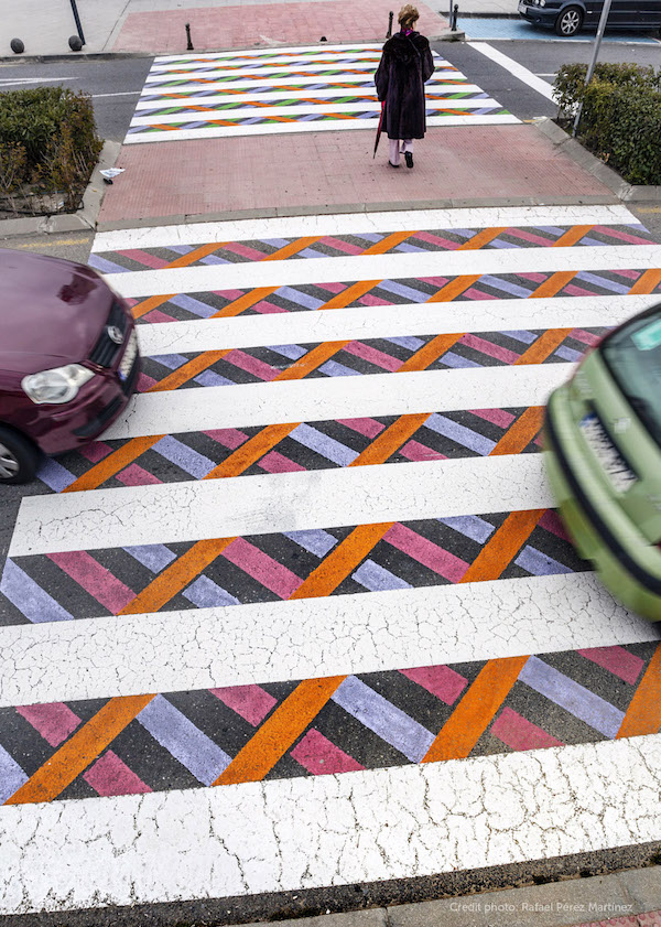 Christo Guelov是一位来自保加利亚的视觉艺术家。在他的奇思妙想之下,西班牙小镇托雷洛多内斯(Torrelodones)的斑马线完全变了样。不再是寡淡拘谨的黑白灰,彩色的钻石或菱形等几何图案在交错,看起来就像是一个艺术家踢乱了平行的斑马线,还顺便洒了手中的好几桶颜料。