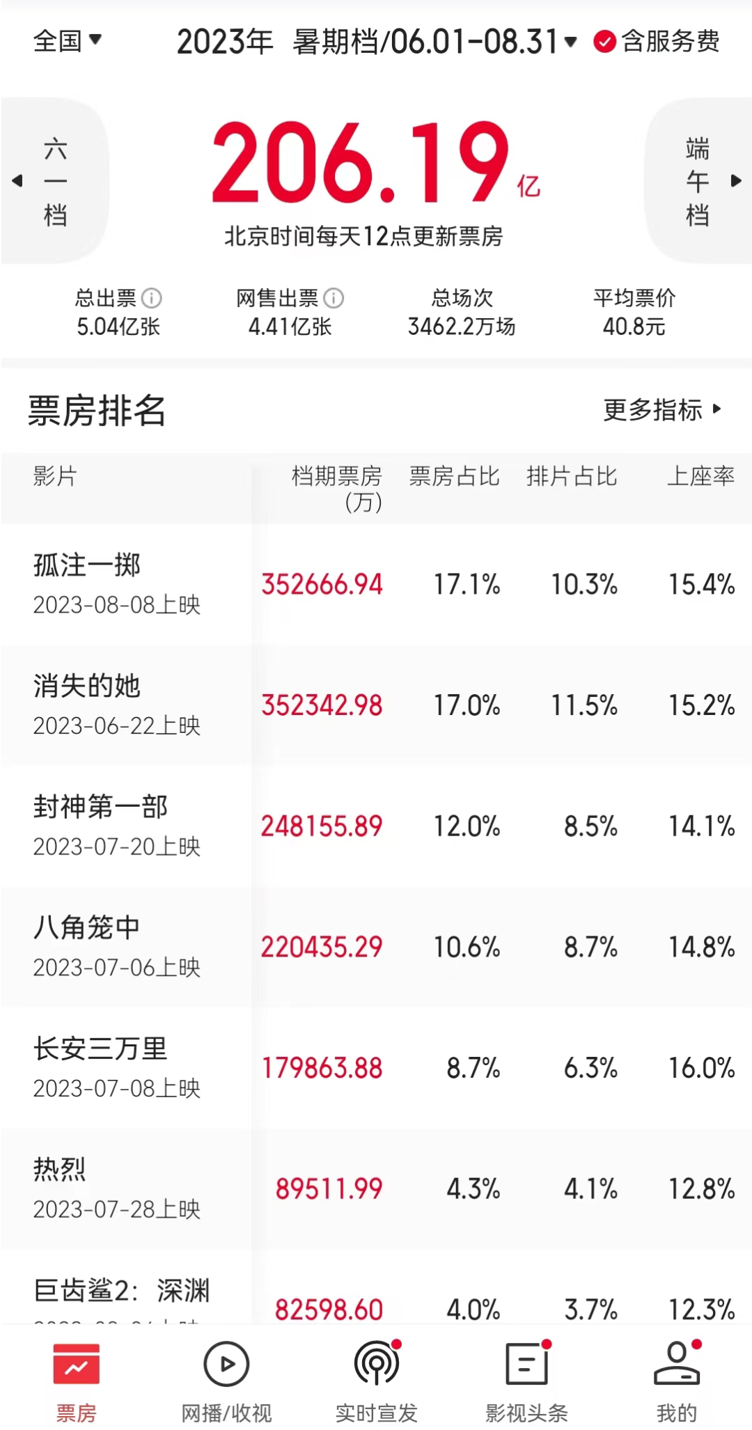 今年暑期档画上了圆满句号:2023年暑期档票房206.19亿元,总观影人次则超过了5.05亿人次,分别创下了中国暑期档最高票房和最高人次纪录。