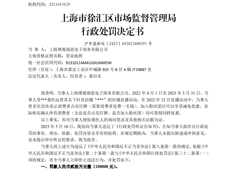 信用中国官网显示,今年6月,抖音店铺“adidas官方旗舰店”运营商上海博观瑞思电子商务有限公司因虚假宣传,被徐汇区市场监管局罚款20万。处罚信息显示,阿迪达斯抖音官方旗舰店宣称点亮灯牌、加入粉丝团、粉丝团够XXX人,便可上架某款商品并享受减免优惠,但实际消费者无论是否点亮灯牌、加入粉丝团,均可获得同样优惠,该行为明显属于诱导关注及憋单违规行为。