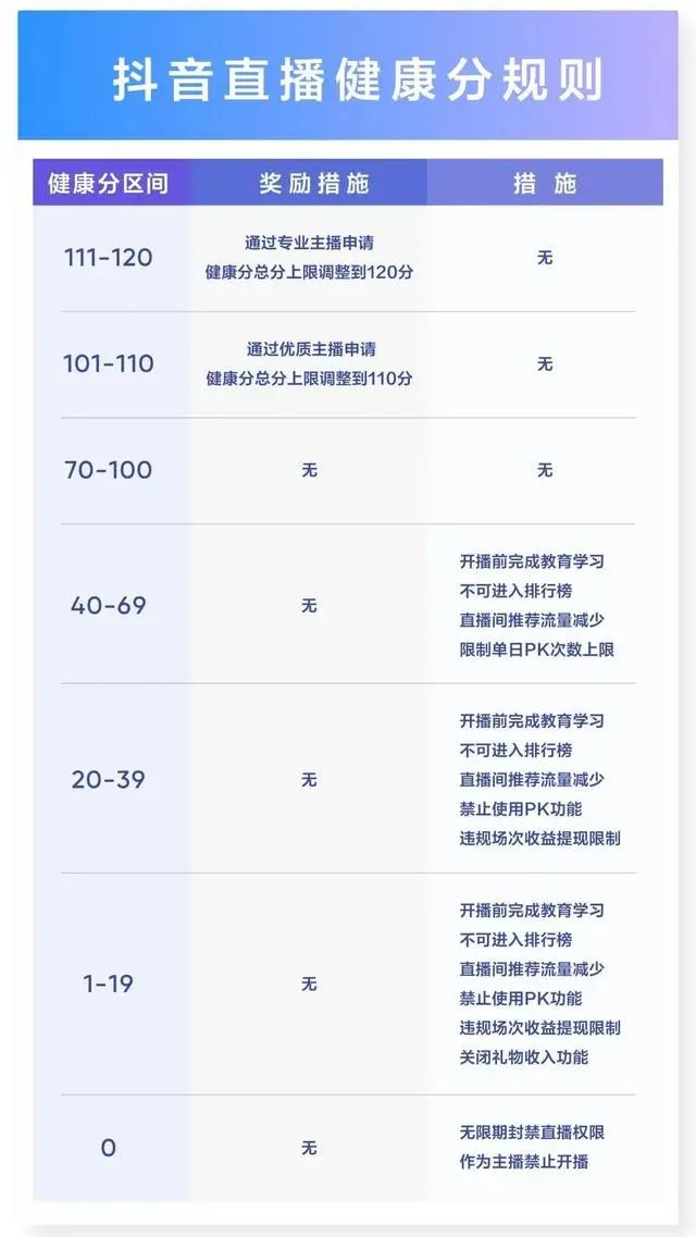 9月7日,抖音直播发布《健康分试运行公告》(下称公告)及《抖音直播健康分扣分管理规范》(下称规范),并从即日起开始试运行新版健康分管理制度,10月底前覆盖全部内容主播,预计于年底前正式生效。公告称,平台将根据主播日常直播行为予以账号健康分,并依据分值对主播账号采取阶梯式管理。