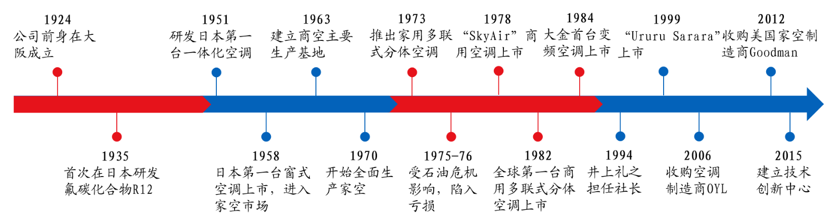 回顾大金百年成长,基本可以用一句话概括:化工起家,集中空调主业,历经多重困阻艰难前行,凭借技术优势和全球布局成为全球空调龙头。