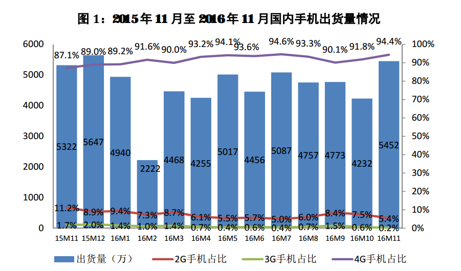 报告显示,2016年1-11月,国内手机市场出货量4.97亿部,上市新机型1320款,同比分别增长7.6%和下降4.1%。而仅在11月,国内手机市场出货量5452.1万部,同比增长2.4%;上市新机型99款,同比下降34.0%。