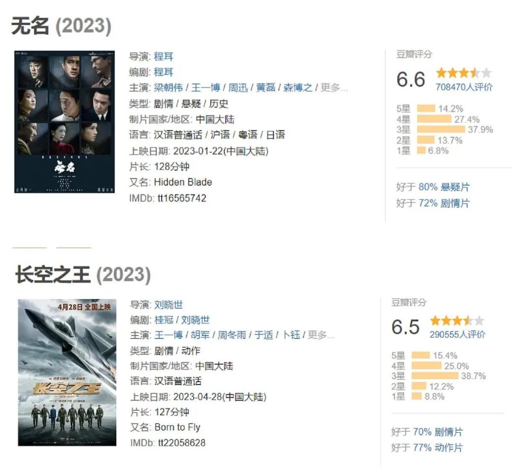 但搜索发现,除了《黑暗荣耀第二季》豆瓣评分达到9.1,剩下的作品评分大多在5-7分,市场评价并不高。王一博参演的两部电影中,《长空之王》评分6.5,《无名》即便有知名导演程耳和影帝梁朝伟坐镇,评分也仅有6.6分。上半年,乐华旗下艺人参演播出的作品大多未能收获良好的口碑,陷入既不叫好又不叫座的尴尬境地。