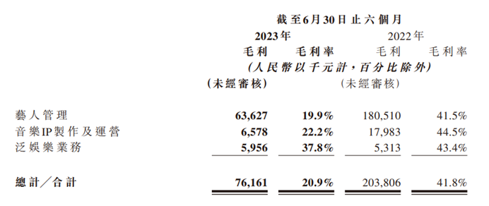 截至2023年6月30日的六个月,乐华娱乐实现收入3.65亿元,同比减少25.2%。主要是艺人管理和音乐IP制作及运营业务收入期内出现了明显下滑。上半年,艺人管理业务收入同比减少26.6%至3.19亿元,占比总营收87%,毛利同比减少65%至6363万元,毛利率仅有19.9%,与上年同期相比减少21.6个百分点。与此同时,音乐IP制作及运营收入同比也减少26.7%至2963.8万元。与上年同期相比,该板块业务毛利同比减少63%至657.8万元,毛利率同比减少了22.3个百分点。