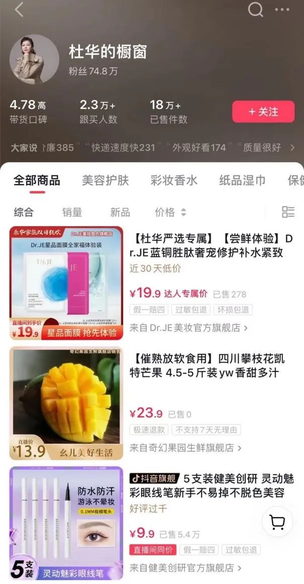 首先是杜华个人IP的打造和变现。频繁登上各大热门综艺、更新短视频展现娱乐圈日常、穿梭各大直播间卖面膜、在抖音开启“杜华严选”直播带货好物……