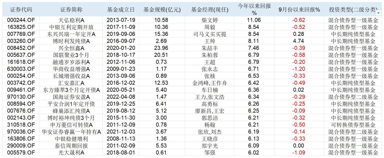 统计今年以来涨幅最多的前20只基金可以看到,截至9月11日,天弘稳利是唯一一只涨幅超10%的混合债券型一级基金。中报数据显示,基金A类份额规模从今年一季度的0.61亿元增加到10.47亿元。