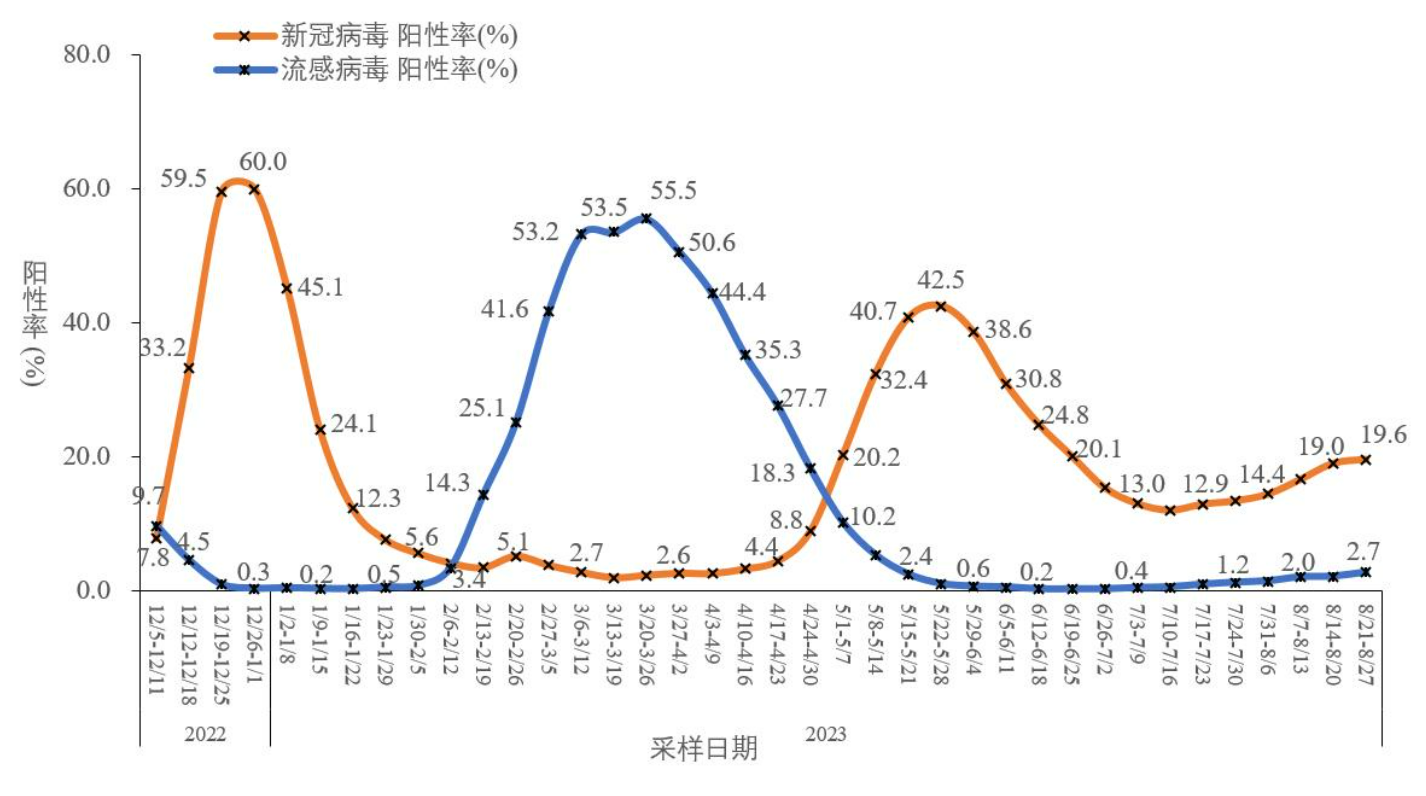 中疾控日前发布2023年8月全国新型冠状病毒感染疫情情况显示,全国哨点医院流感样病例新冠病毒阳性率从第31周(7月31日-8月6日)的14.4%缓慢上升至第34周(8月21日-8月27日)的19.6%。