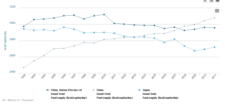这张图(指上图)能帮助我们理解今天中国社会正在发生的转型。最上面的曲线代表我国台湾人民过去20年中人均摄入卡路里的变化,一路向下,至少有两个原因,第一,人口老龄化,第二,老百姓越来越注意了,不吃那么多了,所以它是一个下行的趋势。中间的曲线是日本,比台湾低不少,也是个下行的趋势,说明日本社会第一更加老龄化,第二民众饮食更加注意。你到了日本去吃饭,有的餐馆会在每一个菜上会插一个牌子,告诉你这道菜里有多少卡路里,搞得你可能一下没胃口了。