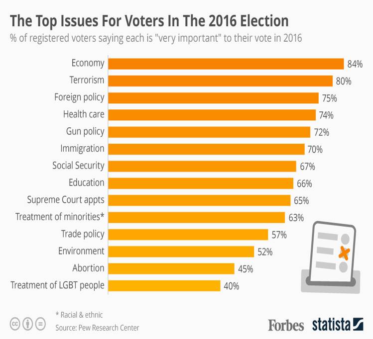 这张图(指上图)显示了美国选民关心话题的排序,分别为:经济、恐怖主义、外交、健康、枪支政策、移民、社保、教育、最高法院法官人选,少数族裔权益,贸易政策,堕胎,同性恋人群权益。你会发现,排在最前面的,第一就是经济,或者生计,第二就是安全。经济方面,从08年金融危机至今,经济总体复苏缓慢;安全方面,美国和欧洲发生的一系列恐怖袭击,让社会失去了基本的安全感。希拉里是建制派,一直为美国的现状和自己辩护,这有一点像中国男足说我们踢的其实挺好的,主力队员希拉里还积极申请做队长兼教练,信誓旦旦承诺带领大家冲出亚洲,走向世界,听上去也没什么说服力。特朗普以批判现实横空出世,尽管离经叛道,口无遮拦,但很多人觉得话糙理不糙,说出了他们的心声,尽管他们也不太相信特朗普能够有办法改变现状,但他们觉得能够承认现实,面对问题,至少是一个进步。