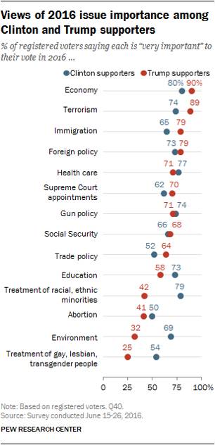 这张图(指上图)更加能够说明问题。这张图上蓝色的点是大选前希拉里支持者关注的问题,数字是关心的人数比例,红色则对应特朗普的支持者。你会发现有一个规律,特朗普的支持者对前面几个问题更加关注,经济、安全,而希拉里的支持者对图底部的问题例如同性恋问题、环境问题等的关注超过特朗普的支持者。换句话说,特朗普支持者更加关心现实问题,希拉里的支持者说好听一点比较有理想。最后,现实战胜了理想。